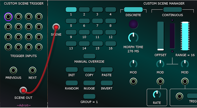 The Duality Morphing Synthesizer patch demonstrates using Custom Scene Manager’s CONTINUOUS mode to morph between two different scenes. It has its own webpage here.
